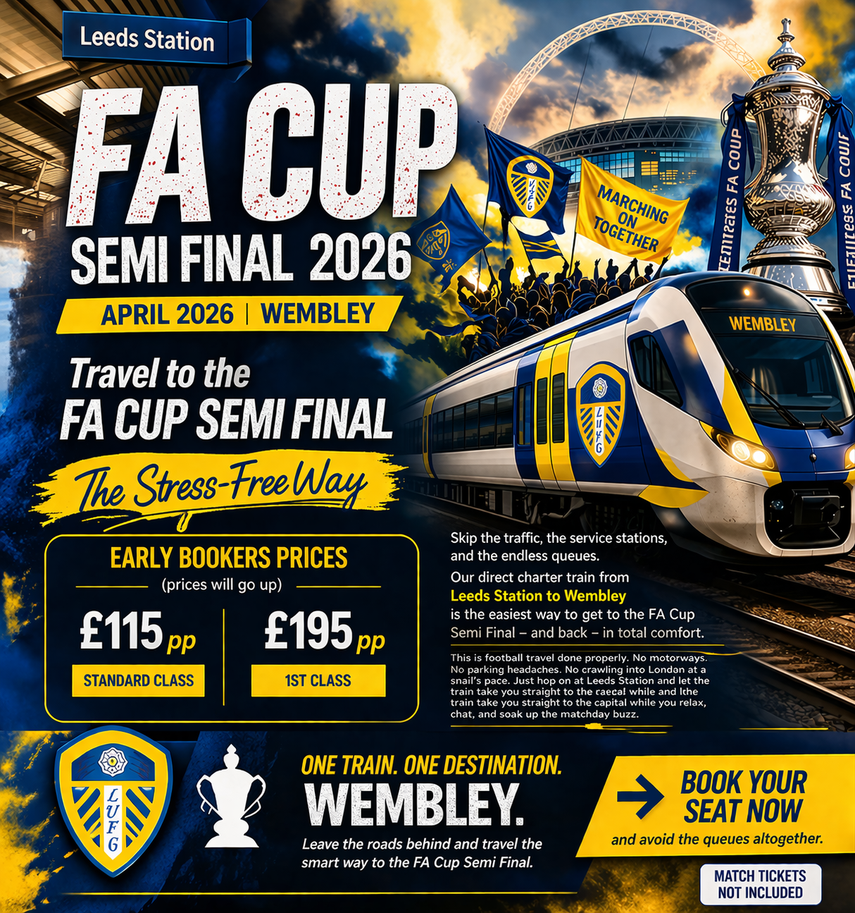 Skip the traffic, the service stations, and the never-ending queues. Our direct charter train from Leeds to Wembley is the easiest way to get to the Fa Cup semi Final — and back — in total comfort.