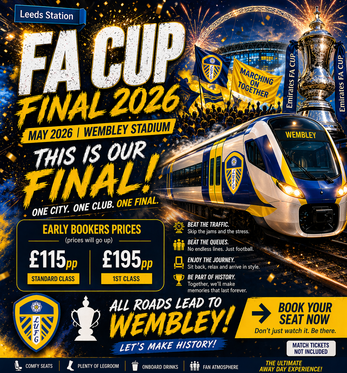 Skip the traffic, the service stations, and the never-ending queues. Our direct charter train from Leeds to Wembley is the easiest way to get to the Fa Cup Final — and back — in total comfort.